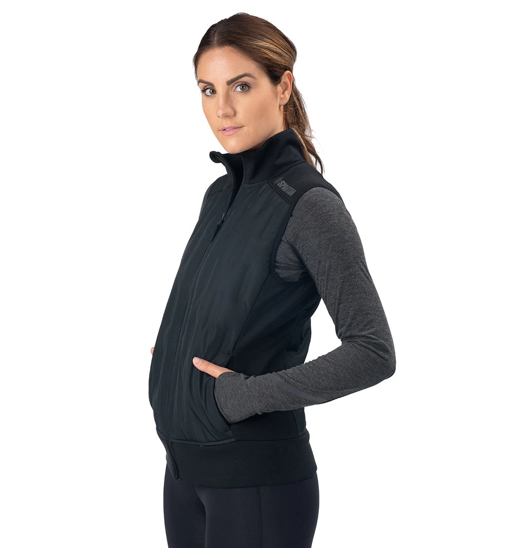 Dual fabric vest with down-padding provides warmth in cool weather.