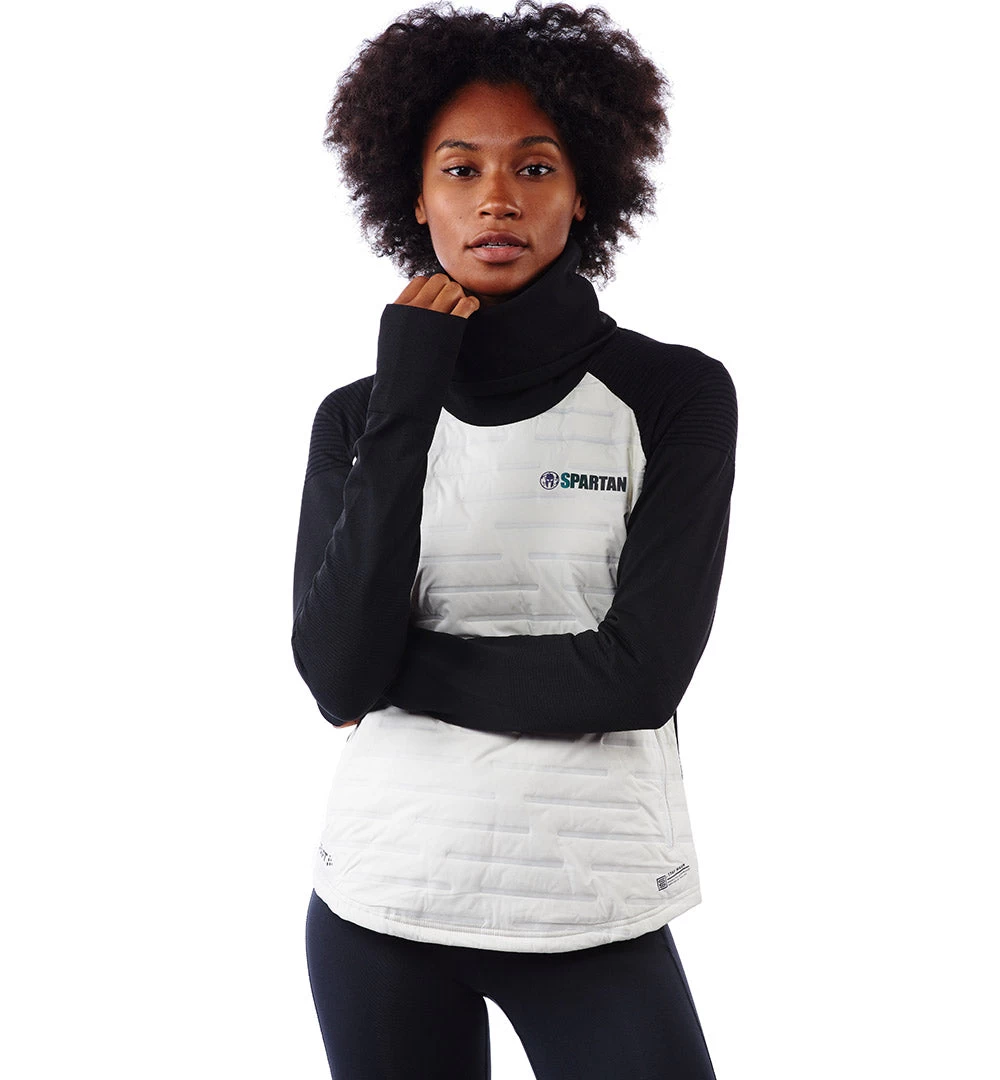 Cold-weather hooded running sweater with padded front for warmth and comfort.
